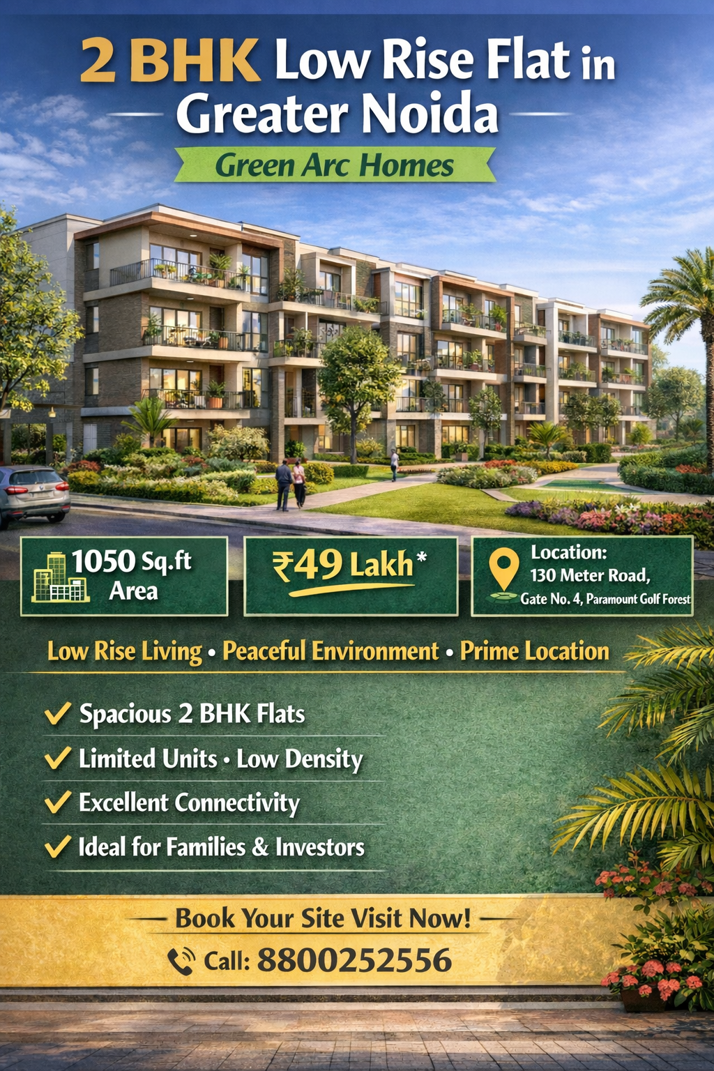 If you are looking for a peaceful, low-density, and affordable home, then a 2 BHK low rise flats at Green Arc Homes in Greater Noida is the perfect option for you. This project is ideal for buyers who want to live away from the high-rise crowds, in an open environment, and in a prime location.